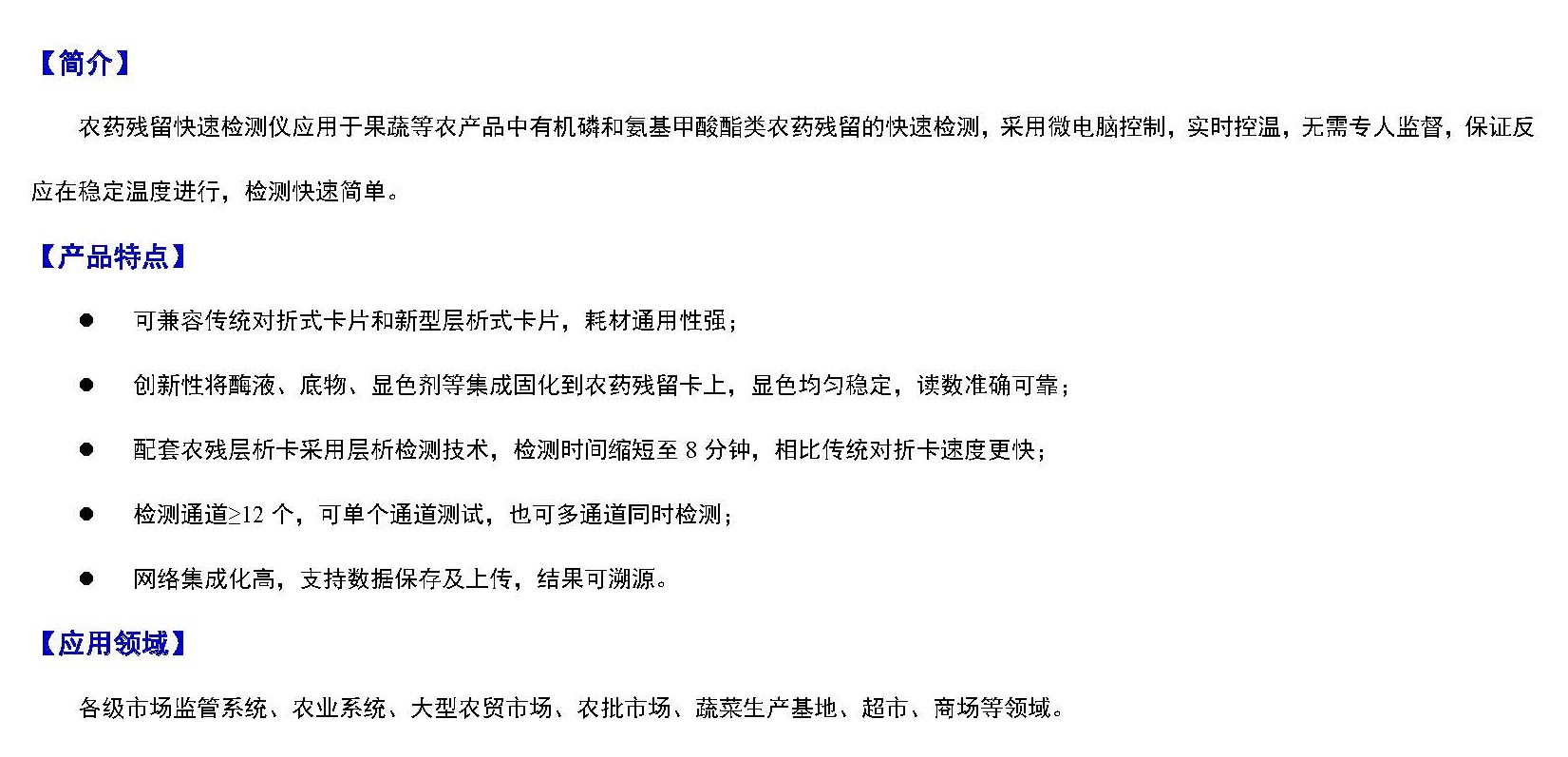 農藥殘留快速檢(jiǎn)測儀應(yīng)用於果(guǒ)蔬等農產品中有機磷和氨基甲酸酯類農藥殘留的快速檢測,采用(yòng)微電腦控製(zhì),實時控溫,無需專人監督,保證反應在(zài)穩定溫(wēn)度(dù)進行(háng),檢測快速簡(jiǎn)單。