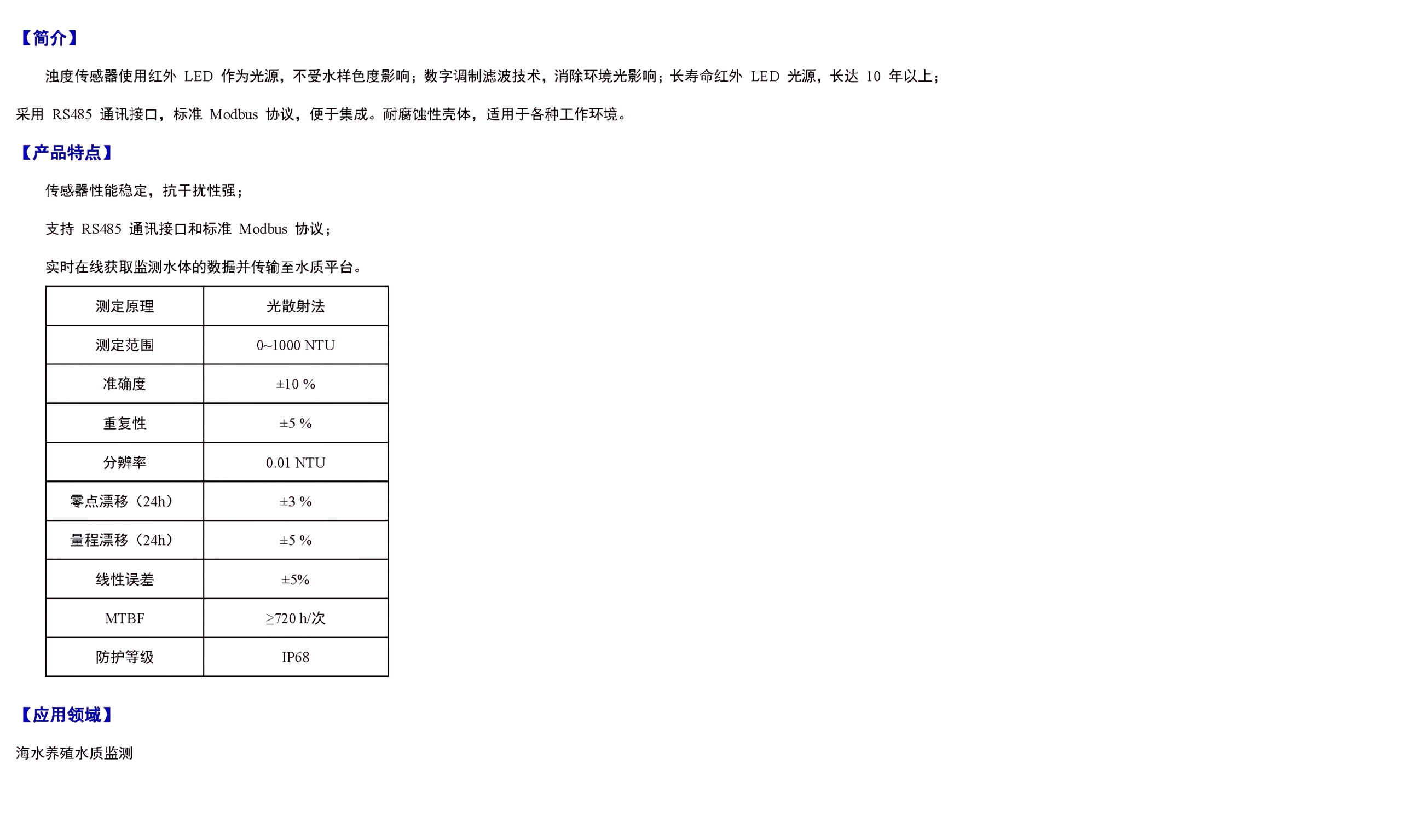 濁度傳感器使用紅外 LED 作為光源,不受水樣色度影響;數字調(diào)製濾波技(jì)術(shù),消除環境光影(yǐng)響;長壽命紅外 LED 光源,長達 10 年以上;采(cǎi)用 RS485 通訊(xùn)接口,標準 Modbus 協議,便於集成。耐腐蝕性殼(ké)體,適用於各種工作環境。