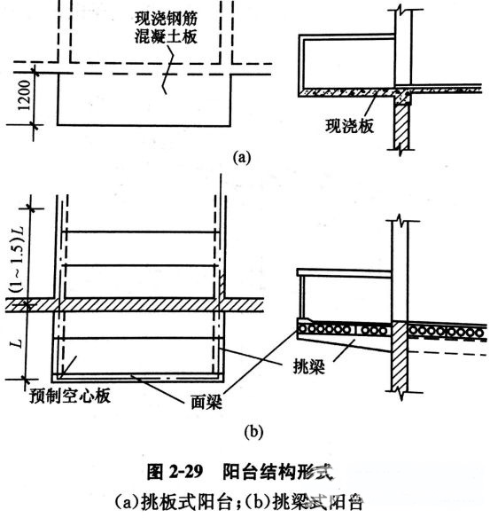 陽台形式很(hěn)多,在使用(yòng)方麵,有生活陽(yáng)台、******陽台。生活陽台供生活起居之用(yòng),******陽台為(wéi)從(cóng)事家務活動等用。而陽台結構形式有挑板式陽台和挑梁式陽台兩種,見下圖。